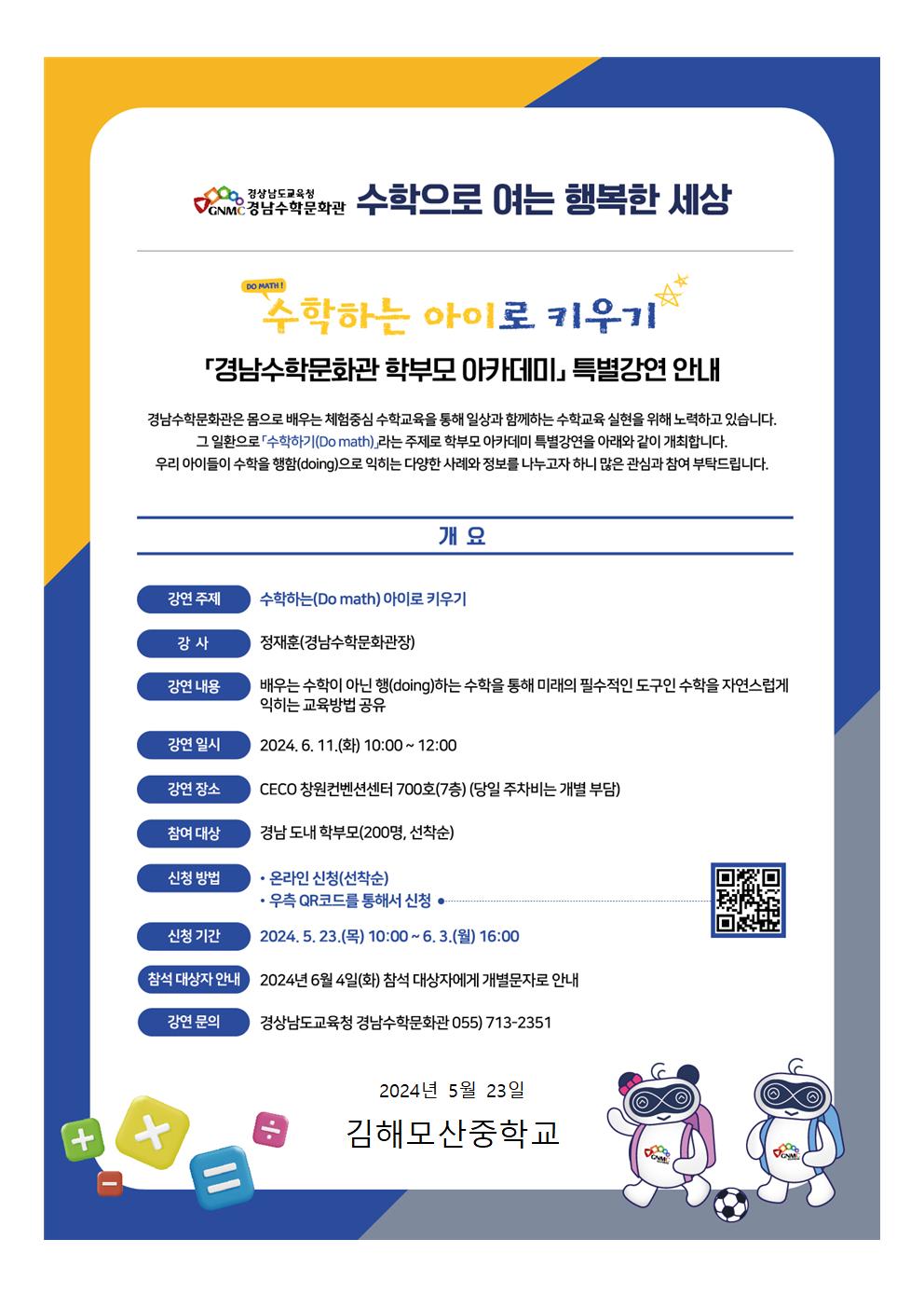 경남수학문화관 학부모 아카데미 특별강연 안내장